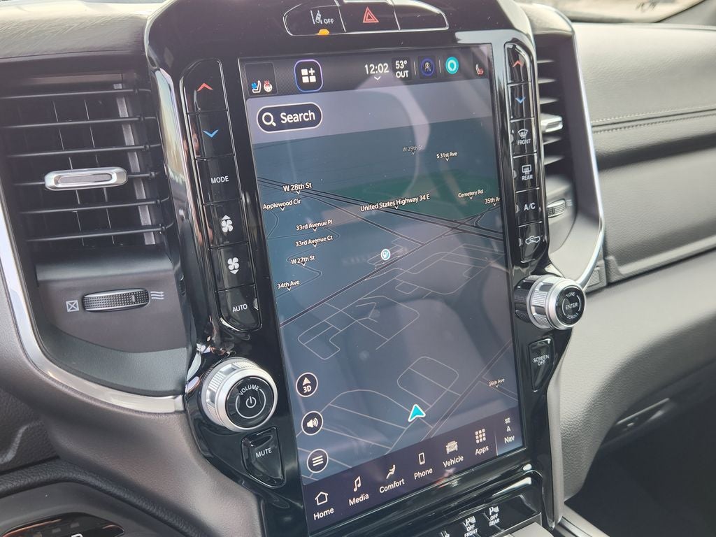 Stepping inside, the Laramie's cabin exudes refinement and sophistication. Sink into the leather-trimmed bucket seats, which offer both heating and ventilation for ultimate comfort. The 12-inch Uconnect 5 Navigation system with 360L connectivity keeps you seamlessly connected, while the premium audio system delivers an immersive listening experience.